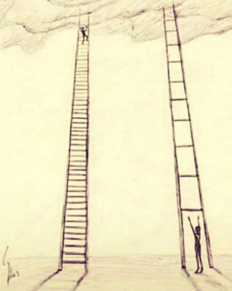 Both ladders are heading in the same direction, they both appear to be reaching the same heights. The one on the left has a person at the top, with many little steps to reach the destination. The one on the right has a person at the bottom, unable to reach even the first rung of the more spaced apart rungs.