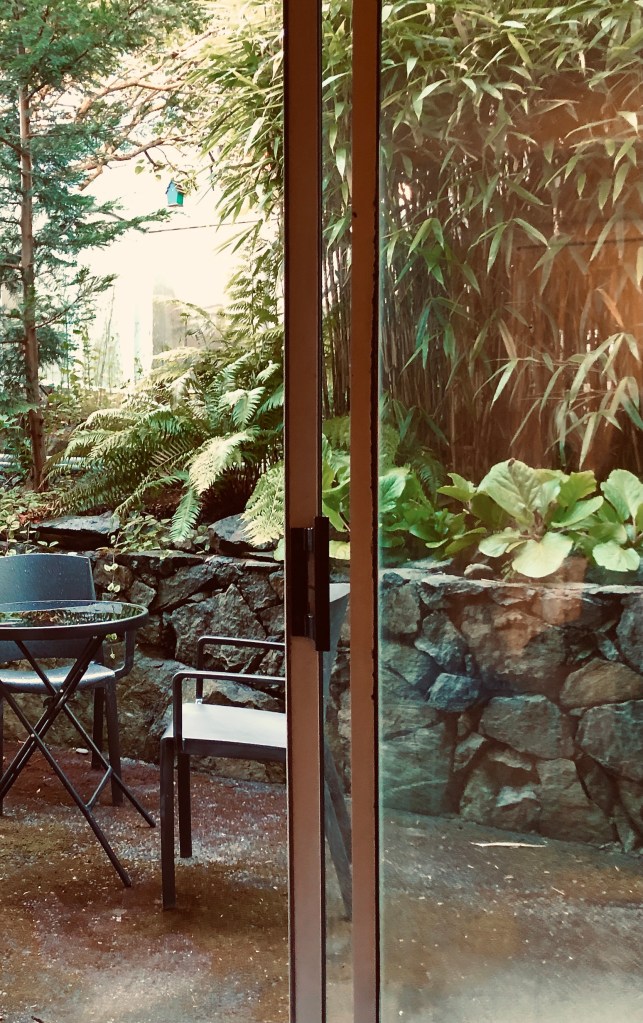 Dampness … on the chairs, the table, the leaves of the plants and trees, from the early morning rains.