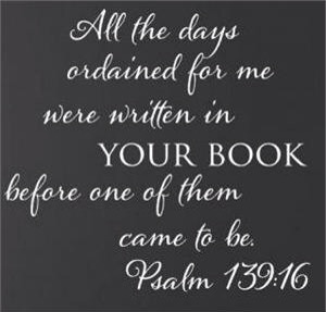 “I am the creation spoken about in Psalm 139:13 – 16 “For you created my inmost being; you knit me together in my mother’s womb. I praise you because I am fearfully and wonderfully made; your works are wonderful, I know that full well. My frame was not hidden from you when I was made in the secret place. When I was woven together in the depths of the earth, your eyes saw my unformed body. All the days ordained for me were written in your book before one of them came to be.” (NIV)